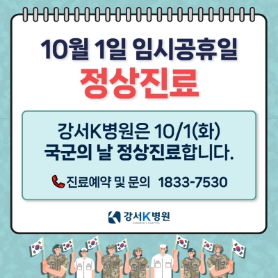 올 해 국군의 날은 임시공휴일로 지정되었는데요. 강서K병원은 평일 진료가 어려운 분들을 위해 모든 진료과가 정상적으로 진료합니다. 진료가 필요하신 분들은 진료 일정 확인하시기 바랍니다. 감사합니다.
