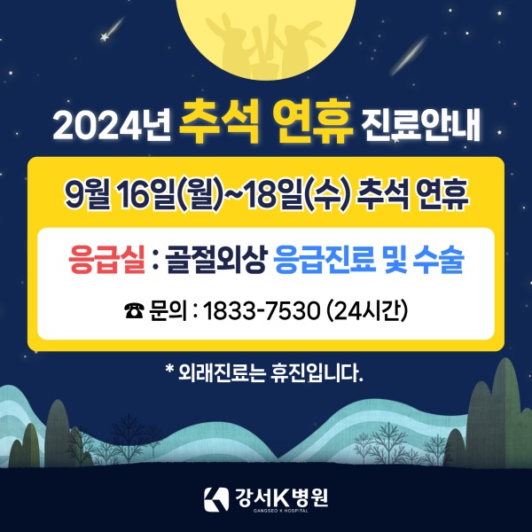 ![]() 2024 추석 연휴 강서K병원의 진료 일정을 안내해 드립니다.