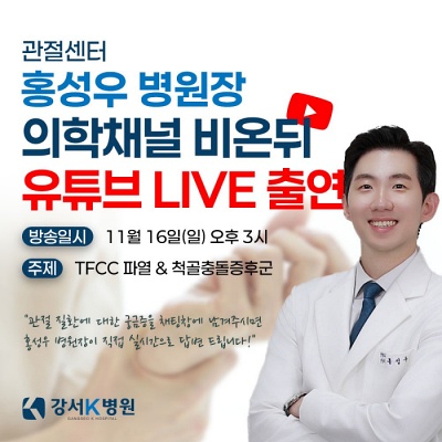 ![]() 강서K병원 관절센터 홍성우 병원장이 오는 11월 16일(일) 오후 3시 유튜브 <의학채널 비온뒤>에 생방송으로 출연합니다!