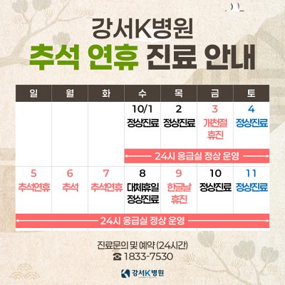강서K병원 10월 추석연휴 진료 안내 / 24시 응급실 정상 운영