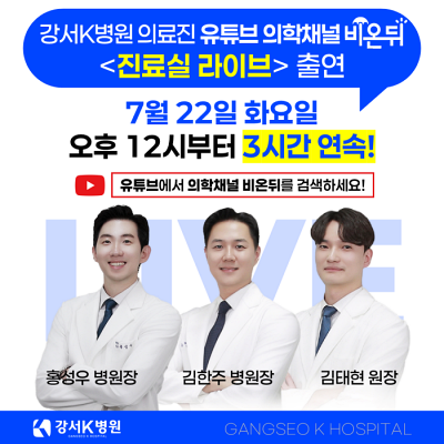 ![]() 강서K병원 홍성우 병원장, 김한주 병원장, 김태현 원장이 오는 7월 22일(화) 오후 12시부터 유튜브 의학채널 비온뒤 <진료실 라이브>에 출연합니다.