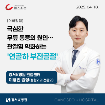 ![]() 관절센터 이형민 원장(정형외과 전문의)의 의학칼럼 「극심한 무릎 통증의 원인… 관절염 악화하는 '연골하 부전골절'」이 헬스조선에 보도되었습니다.